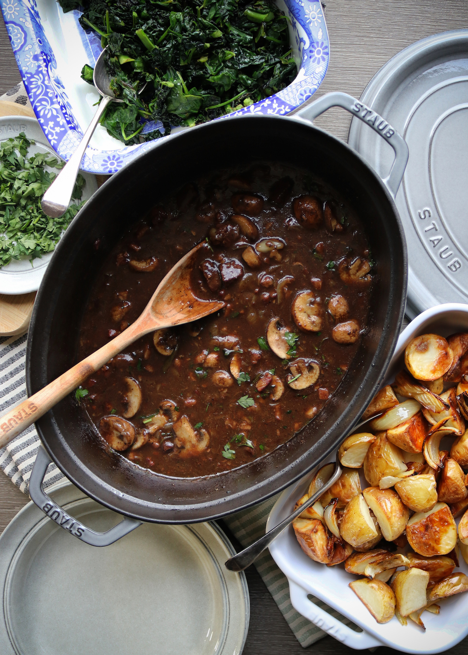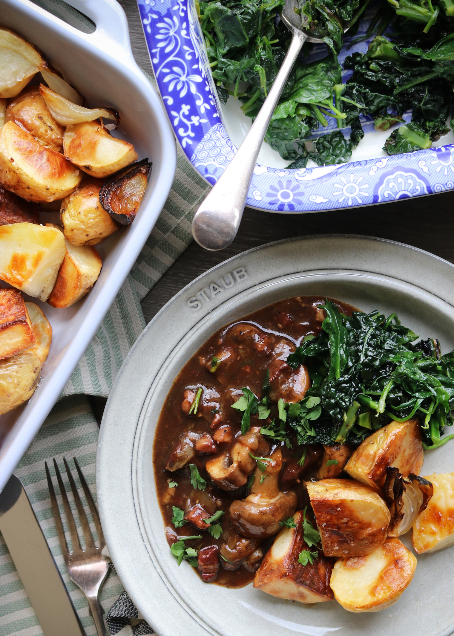 Venison Bourguignon Published: 05-02-2023 British Venison is a healthier alternative to beef, is in season through the colder months of the year and buying wild venison is a great way to support sustainable woodland development. We buy venison from the Spains Hall Estate which you can view here. So what’s the difference between venison and beef? It’s all to do with the way the animals are raised – beef cattle are farmed, whereas venison is wild game. Venison is lower in saturated fat than other red meats, a great source of haem iron, packed with zinc and B vitamins. This is a classic bourguignon recipe but it’s a good one, super reliable and very quick and easy. You can make it gluten free by using gluten free plain flour. We didn’t make dumplings with this as we did crispy potatoes but of course you could include some for a real feast! Ingredients 400g shallots, peeled but left whole 260g pancetta 800g diced stewing venison 5 cloves garlic, peeled and grated or finely chopped 250g mushrooms, cut in half (or whole button ones are good too) 1 tbsp plain flour (use GF if required) 1/2 bottle red wine 500g beef stock 3 or 4 large sprigs of rosemary 5 large bay leaves 1 tbsp redcurrant jelly Sea salt & freshly ground black pepper Method 1. Pre-heat the oven to 160C static, 140C fan. Bring the venison out of the fridge so it comes up to room temperature, put in a bowl and season with salt and pepper. In a large heavy cast iron or similar pan (we used a Staub oval cast iron cocotte) add a good few glugs of olive oil and add the shallots and bacon, then sauté until lightly browned. Remove from the pan with a slotted spoon and place on a plate and then add the venison and sauté until browned on all sides. 2. Next add the shallots and bacon back in and stir in the garlic. Add the flour and quickly stir to combine – keep the heat low-med so the flour doesn’t burn but once everything is coated, turn the heat up and add about 1/4 bottle red wine – combine and be sure to scrap around the pan, then add the rest of the wine and the beef stock. Bring up to a rolling simmer and season with salt and pepper. 3. Turn off the heat and stir in the redcurrant jelly, add the bay leaves and rosemary sprigs. Put the lid on and place in the oven for 3 -4 hours. 4. Towards the end of the cooking time, fry off the mushrooms in a little olive oil to crisp up and add to the pot. 5. After the cooking time you can serve immediately – when you test the seasoning you might like to a little more redcurrant jelly as it gives a nice depth. But as you probably already know when it comes to stewing, for the very best flavour allow the pot to cool to room temperature, cover and refrigerate overnight. Re-heat gently over medium-low heat, and serve the next day. We served with crispy roasted potatoes and onions and steamed cavolo nero and spinach. Share this article Copy this link https://www.humphreymunson.co.uk/venison-bourguignon/ Share Copy link Previous Article How to design the ultimate bootility room Next Article Should I use marble in my kitchen?