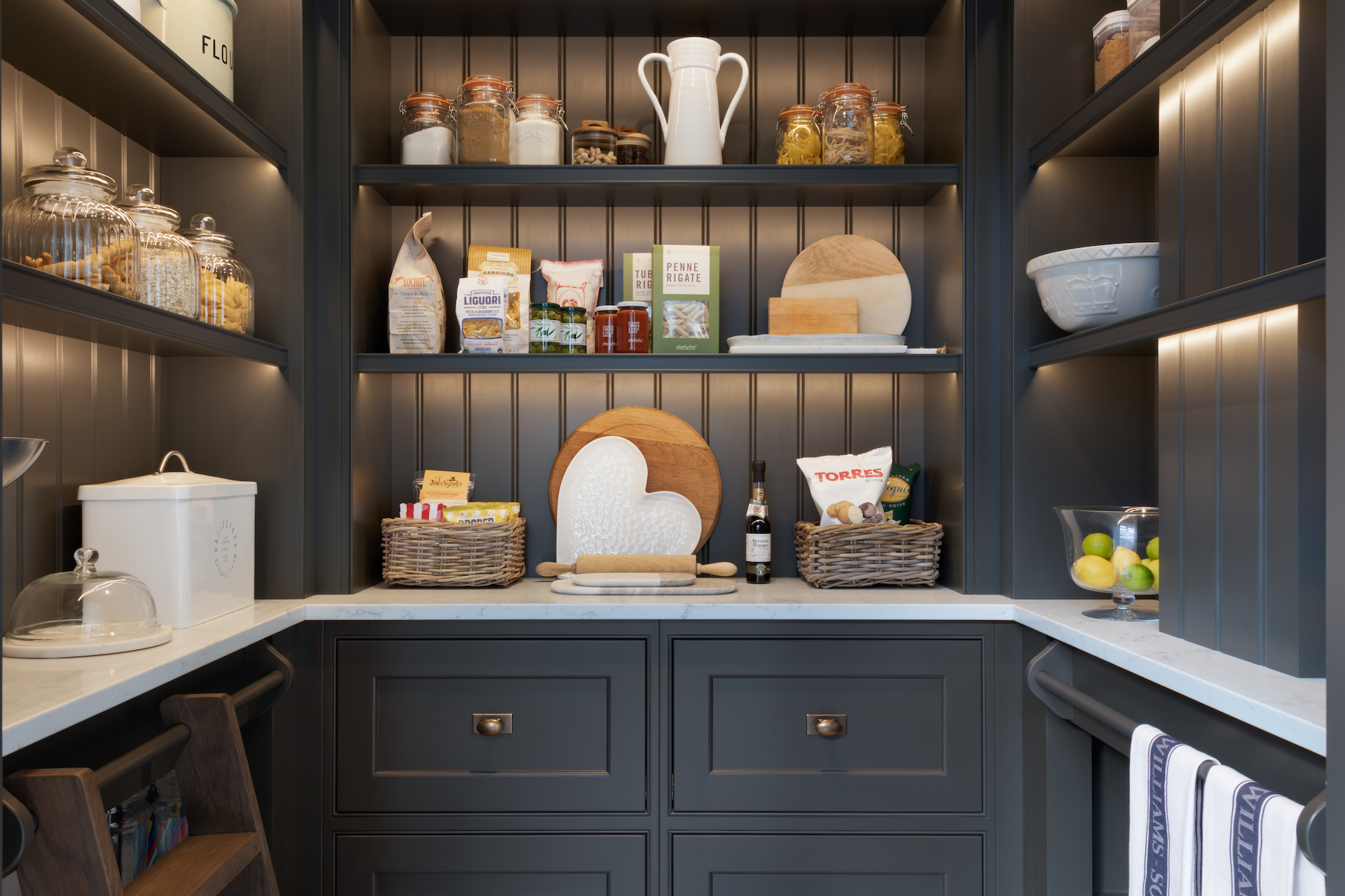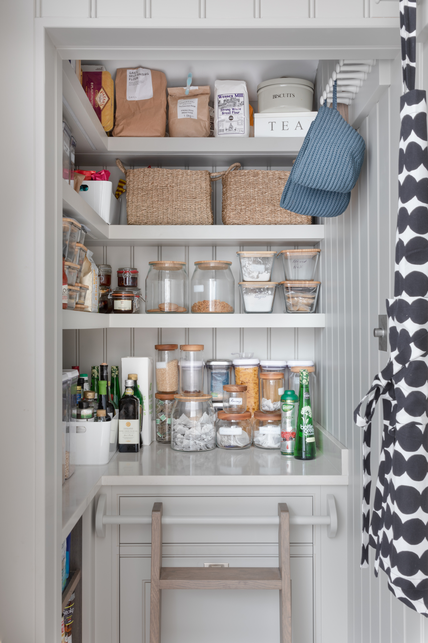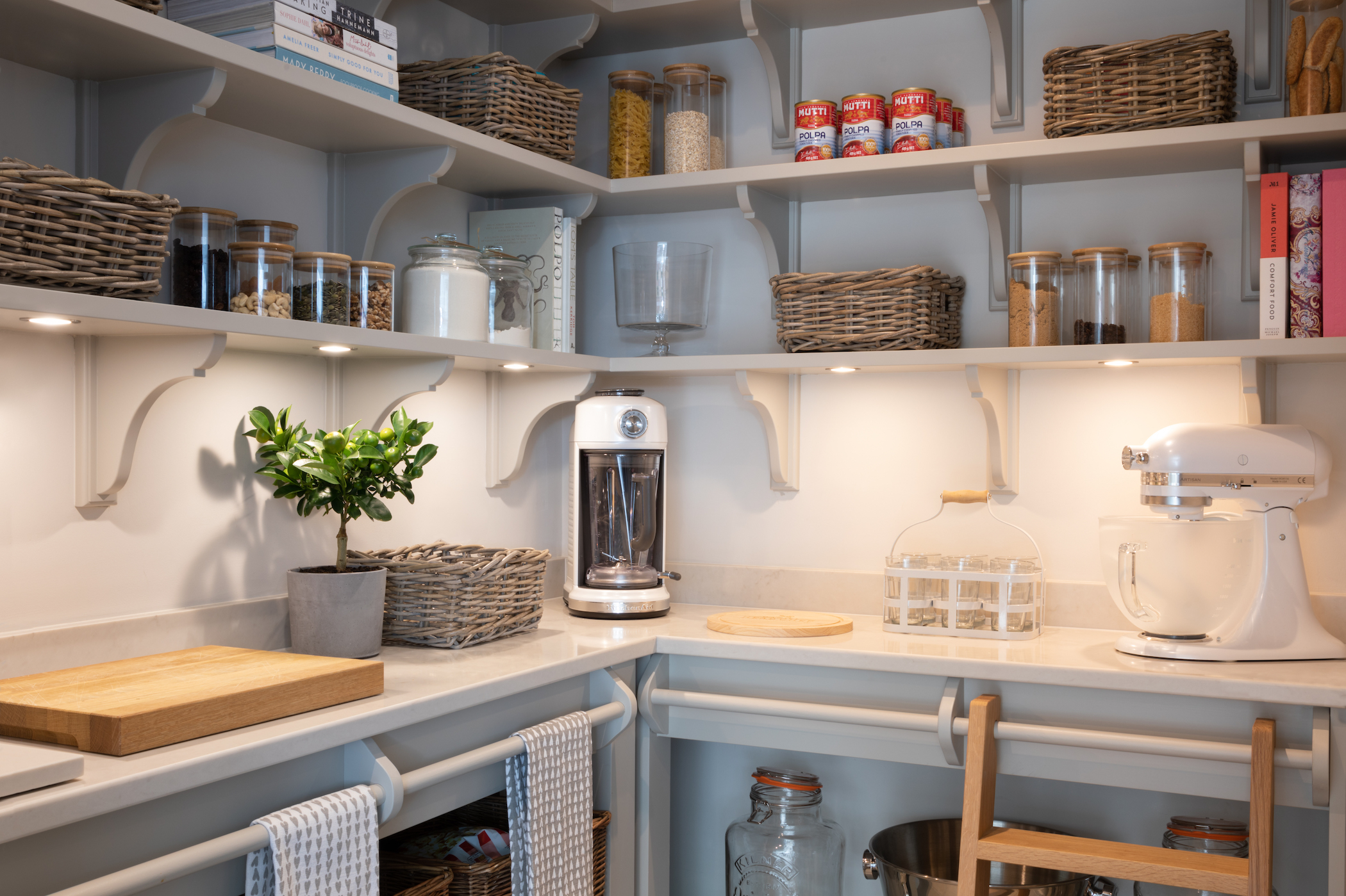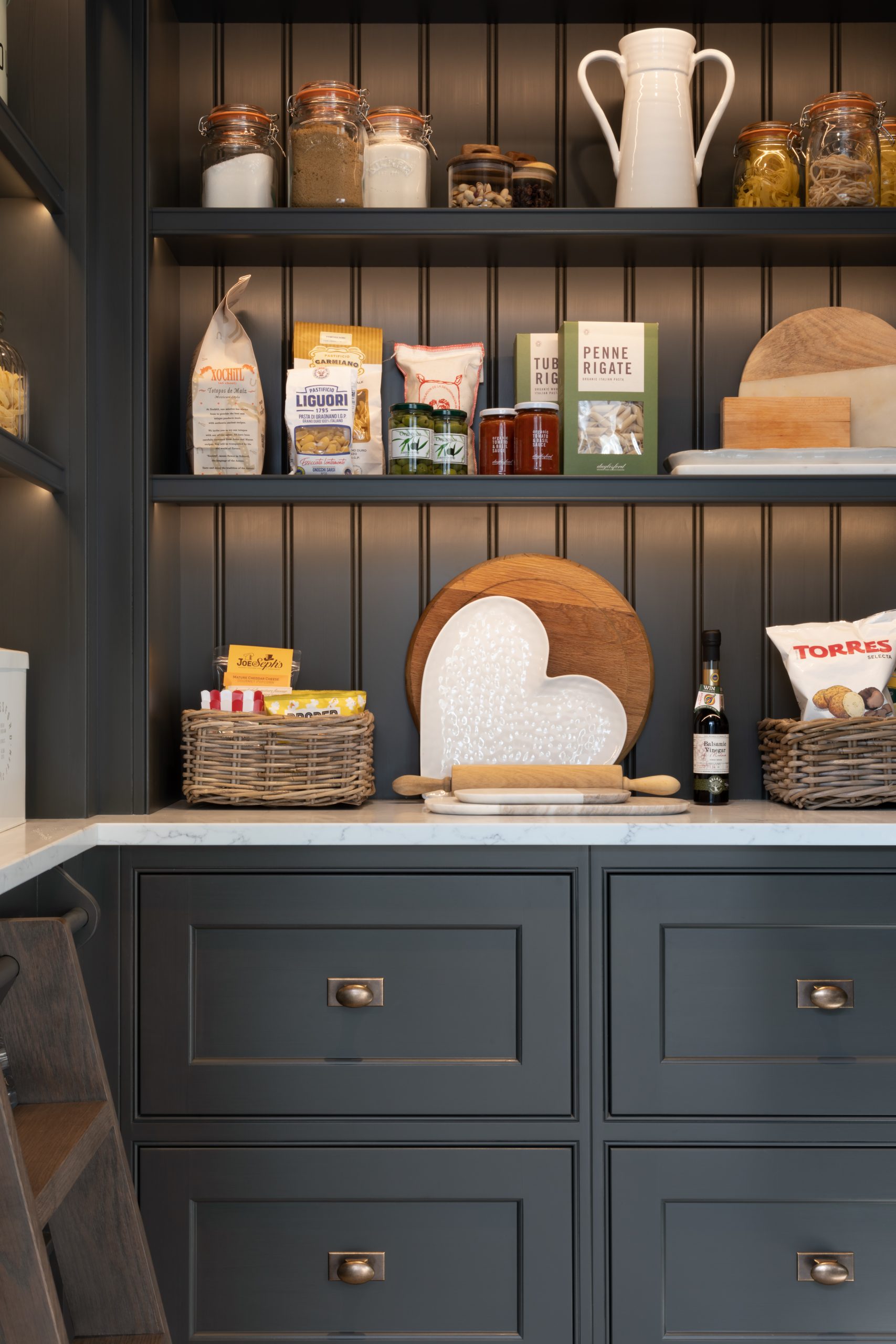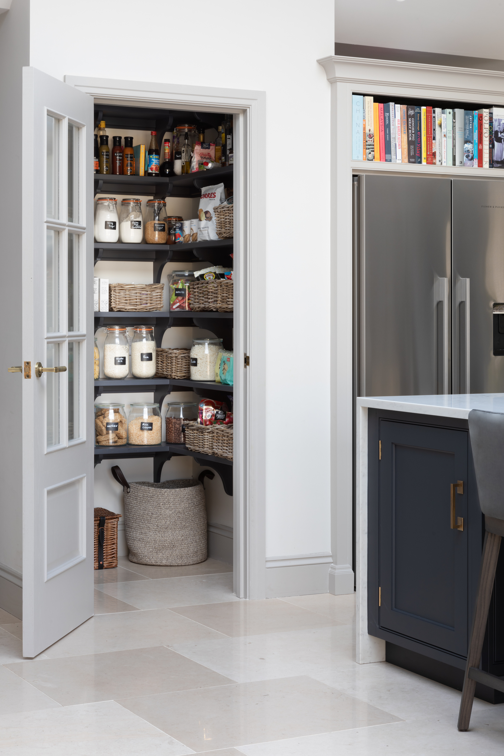 Walk in Pantry | Design Tips Published: 30-12-2020 On the wish list for many clients, a walk in pantry takes pressure off the main kitchen by injecting a huge amount of hidden storage into the home. If you remove all the dry goods from the main kitchen, you free up an abundance of space that can be utilised for other things such as equipment, crockery, glassware – or anything else you can think of that you don’t want in the kitchen. Without a doubt, the number one reason to include a walk in pantry is zoning – a space dedicated to dry goods storage means you only ever have to visit one location, no more rooting through cupboards or drawers trying to find that elusive key ingredient. It just makes life easier. The Barnes village project for example (pictured above) is ultra organised with labelled Kilner jars and baskets keeping everything neat and tidy. No clutter here. In terms of accessibility, the pantry ideally needs to be close enough to the kitchen to grab items for recipes of pre-made dishes at a moment’s notice. It’s not the end of the world but it is frustrating if the pantry is positioned on the other side of the house to the kitchen. Our classic HM artisan shelves can be installed according to the height of the room which is great for maximising the storage space available. Artisan shelves are deep enough to store large Kilner jars, small vases etc with the bonus that everything is clearly displayed – no lost jars at the back of cupboards! With plenty of storage space under the countertop, you can choose between deep drawers, cupboards or open shelves depending on your storage needs. Closed storage is great for unsightly items that you use infrequently or large open packets of rice, pasta or flour etc. Whereas open shelving beneath the worktop is ideal for things like wine cases, vases and hampers that all take up a lot of space and can be heavy to manoeuvre, so keeping them at a lower level makes sense from a practical point of view – plus they look great when organised! The worktop in a pantry often acts as an additional food prep and storage space. Choosing a durable material such as quartz is important as the pantry countertop will work just as hard as a worktop in the main kitchen. Worktops are also particularly important at busy times of the year when you’re entertaining friends and family, having an extra run of countertop space can be invaluable. Desserts and other sweet treats, cheese boards etc, can be easily kept out of the way until needed – or until you can’t resist them anymore! Other useful items such as a kitchen aid, chopping boards or large bottles. You may have noticed that many of the walk in Humphrey Munson pantries have a rail that runs along the length of the countertop – this is for the mini wooden ladder so the top shelves can be easily reached (it is also a great spot for keeping tea towels out of view). If you have the space, an optional wall-mounted holder is a great way to store the ladder out of the way when not required, and will deter little ones from reaching goodies kept out of reach. Continuing the theme of the kitchen into an adjoining walk in pantry is key for continuity. The clients at the Kent project (pictured above) for example specified the same weathered bronze hardware in the kitchen which runs through into the pantry also. The same goes for paint finishes, if the kitchen is cool and calm or dark and moody it pays to keep the same ethos in an ancillary room. The island in this project is finished in HM paint colour ‘Soot’ which is the same colour as the nearby pantry cabinetry. No matter the size of the space available, there’s always a way to maximise storage. To find out more call us on 01371 821300 or email us at info@humphreymunson.co.uk. Share this article Copy this link https://www.humphreymunson.co.uk/walk-in-pantry-design-tips/ Share Copy link Previous Article Wine Room | Design Tips Next Article Boot Room | Design Tips