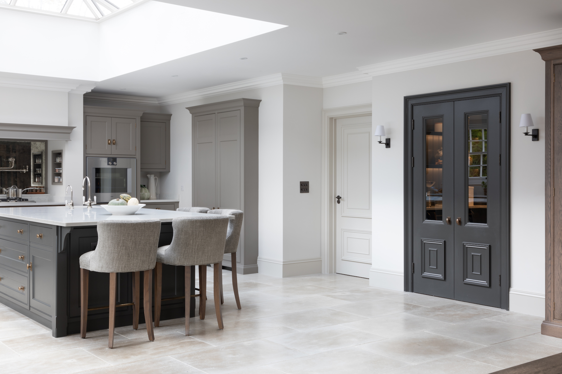 Walk In Pantry | Kent Project Published: 17-01-2021 A walk in pantry has become a much sought after affair in the world of kitchens. We love this example at the Kent project, which has everything you could ever want (or need) safely concealed behind two doors close to the main kitchen/ dining area. Located just off an open plan kitchen/ dining space (with a hidden sitting room just a few paces away too) it’s ideally located for both food prep or grabbing a quick film snack whilst the family debate on which blockbuster to put on next. When open, soft warm lighting reveals dark painted Nickleby cabinetry finished in HM’s paint colour ‘Soot’ – a bespoke colour to Humphrey Munson made exclusively by Mylands. Using natural earth pigments, this is a deep moody green / black, with a subtle sheen which works particularly well with the weathered bronze handles on the drawers and the light quartz worktops. The pantry finish is the same of that used on the kitchen island as well as the hardware and worktops which are the same throughout the project to help maintain a sense of flow and continuity. The first thing you notice when looking at this pantry is the open shelving which offers a multitude of storage for everything from Kilner jars to small chopping boards and vases. Butt & bead panellelling to the backs of the cabinetry offers an additional aesthetic detail. Beneath the open shelving is worktop space which can be utilised for both storing are larger items such as bread tins, cake stands, baskets of food and fruit bowls. The worktop is also ideal for keeping large platters, cakes etc out of the way when entertaining or for food prep when there’s lot going on in the kitchen. Beneath the worktop as you look straight at the pantry are four deep drawers that can be used for larger more unsightly items – such as large packs of flour, or perhaps goodies that you want to hide away out of sight so that you are less tempted to snack between meals. Either side of the pantry beneath the worktop and the pantry ladder rail are deep open shelves used to store large vases, hampers and other, less used larger items that would usually be milling about in the back of a cupboard or on a worktop. We designed around the structural steel support and were able to include two nooks either side to provide accessible storage (rather than blanking it off). One other thing that you might now immediately notice is the two rails on either side of the pantry beneath the worktop. These have been designed for a pantry ladder to sit on (can be spotted to the lower left side of the image) finished in HM Berkeley oak and are ideal for reaching high shelves with ease. These rails are also a great place for storing tea towels and oven gloves out of sight of the main kitchen. Please note, walk in pantries are only available as part of a kitchen project, if you’d like to find out more about a Humphrey Munson kitchen feel free to call us on 01371 821300 or email info@humphreymunson.co.uk. Share this article Copy this link https://www.humphreymunson.co.uk/walk-in-pantry-kent-project/ Share Copy link Previous Article How to seal limestone Next Article Design Notes | Antique Effect Mirror Splashback
